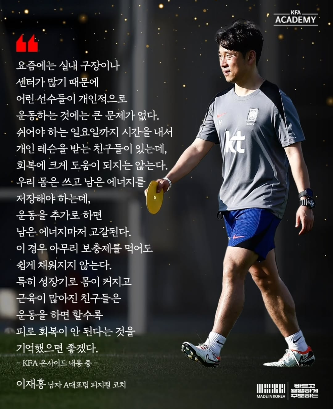 아이들은 잘 모릅니다. 지금 현재가 전부라 생각하고 플레이하고 훈련하거든요. 그렇게 때문에 우리 어른들이 멀리 보고 지금을 어떻게 보내는 것이 옳은지 결정해주어야 합니다. 프로 유스팀이 목표가 아닌 성인 프로팀을 목표로 훈련하고 생활해야 하며, 주변에 휩쓸려 가는 것이 아닌 내가 어떤 과정과 단계에 속해있는지 계속 인지하면서 가야 합니다. 그러기 위해서는 지금과 같은 정보의 홍수속에서 가끔은 귀를 막고 눈을 감는 용기가 필요합니다.