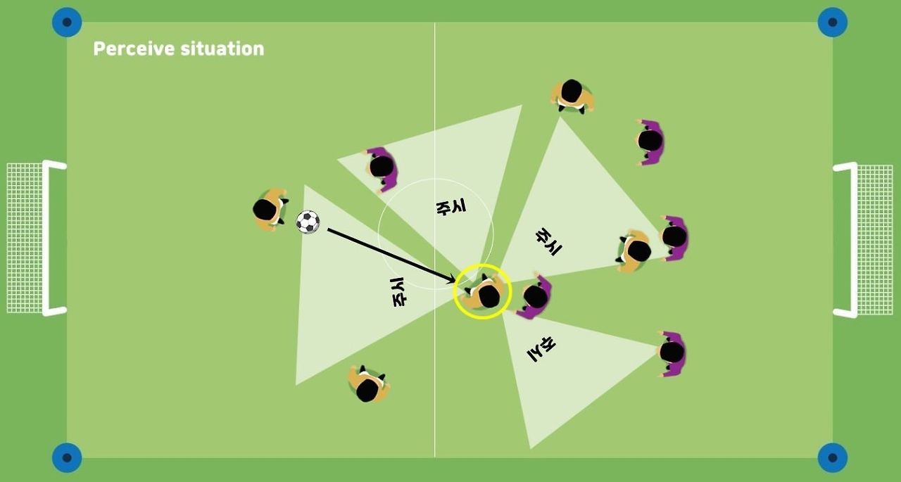 1. Perceive situation - 상황을 주시(인식)하라(볼이 오기 전 주변을 둘러보며 어떤 옵션이 있는지 살핍니다)