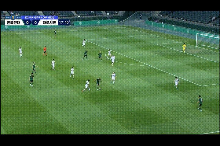 반면 아래는 비슷한 상황이지만 과감한 돌파보다는 안정된 플레이를 선택함으로써 볼이 뒤로 빠지게 됩니다. 이것이 나쁘다기 보다는 이런 상황이 반복되면 볼은 좌에서 우, 우에서 좌로만 왔다갔다하는 단순 U자형 빌드업이 되고 결국 크로스로 마무리됩니다. 참고로 그렇게 올라간 크로스는 약 80개당 하나가 들어간다는 통계가 있습니다. 득점확률이 떨어지는 비효율적 게임운영입니다.