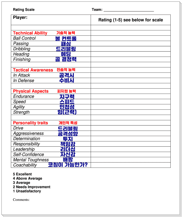 국내뿐 아니라 해외에서도 위와 같은 선수 평가표를 작성하여 지속적으로 선수의 성장을 관찰합니다. 다음은 해외 축구클럽이 선수를 평가하는 항목들입니다.