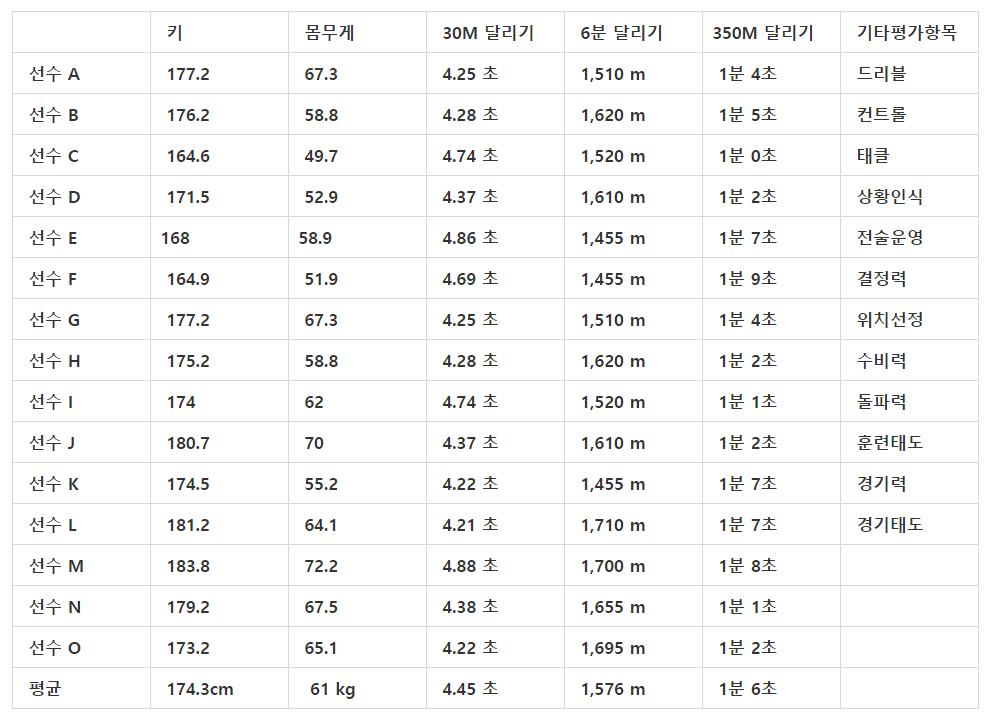 아래는 지인에게서 입수한 중학생 선수들을 대상으로 한 평가자료입니다. 자료가 10년 전 것이기에 지금의 선수들 수준은 전체적으로 올라갔을 것으로 예상하지만 대동소이 할 것입니다. 그 당시 이름만 대면 알 수 있는 팀의 선수들이므로 평균적으로 높은 수준을 가지고 있습니다.