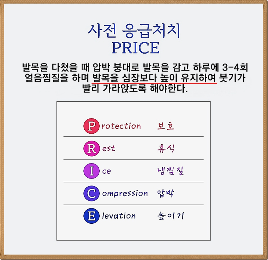 족관절 염좌(발목 삠) : 발목 염좌란 발을 헛디디거나 발목이 심하게 꺾이는 등의 원인으로 근육이 정상적인 운동범위를 벗어나 발생하는 인대 손상을 말한다. 흔하게 발생하지만 대부분 초기에 치료를 적절히 받지 못해 재발하는 경우가 많고 만성화되면 관절염 등 여러 질병을 유발할 수 있다. 그러므로 접질리는 즉시 얼음 찜질을 통해 부상 부위의 염증을 진정시키는 것이 중요하다. 일반적인 치료는 급성일 경우에는 정도에 따라 보조기 사용 또는 깁스고정 등을 하며 만성화된 경우에는 근력 강화 운동 또는 수술을 시행한다. 발목을 다칠 시, 아래의 PRICE를 실천한다.
