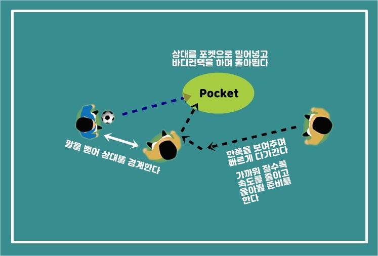 4. 상대가 볼을 차는 순간 포켓(Pocket)으로 밀어넣고 바디 컨택(Body Contact)을 시도한다