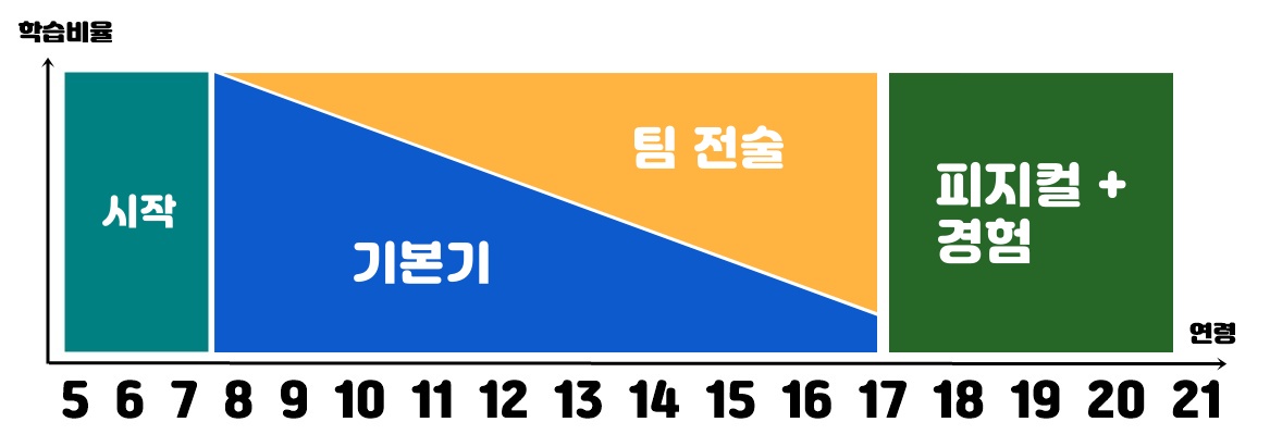 보통 아래와 같은 그래프로 유소년 축구의 커리큘럼을 구성하는데 항상 중요한 것은 디테일이다. 예를 들면 기본기라면 여러 가지의 기본기 중 어떤 것에 비중을 크게 둘 것이고 얼마나 투자할 것인가? 전술도 마찬가지... 그리고 온갖 잡음으로부터 그것들을 꾸준하고 집요하게 끌고 가는 인내도 필요하다. 유소년축구지도를 하면서 이런 사이클을 여러 번 돌려봤기 때문에 어렵지는 않겠지만 과거보다 더 잘하고 싶다.